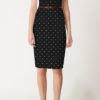 Play Dress Up in Black Halo’s black & white polka dot Jackie O dress with red belt.