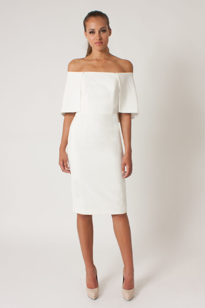 Play Dress Up in Black Halo’s porcelain sheath cape dress. This perfectly tailored dress accentuates the neckline with the off the shoulder cape. This dress is sure to get the most positive attention you have ever had!