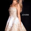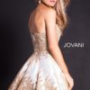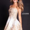 Play Dress Up in Jovani’s white & gold embroidered short dress.