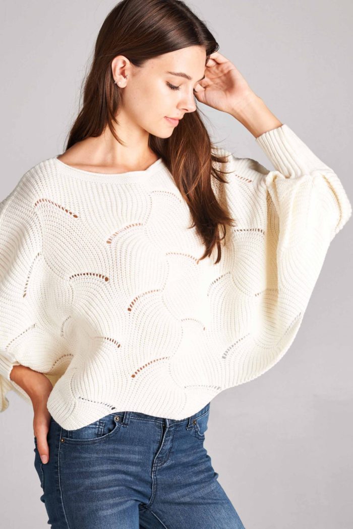 Play Dress Up in this perfect for the fall sweater. The pattern of eyelets and the winged sleeve makes this sweater a definite pick. Dress this sweater up with a pencil skirt or dress it down with your favorite pair of jeans!